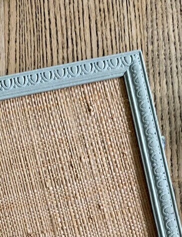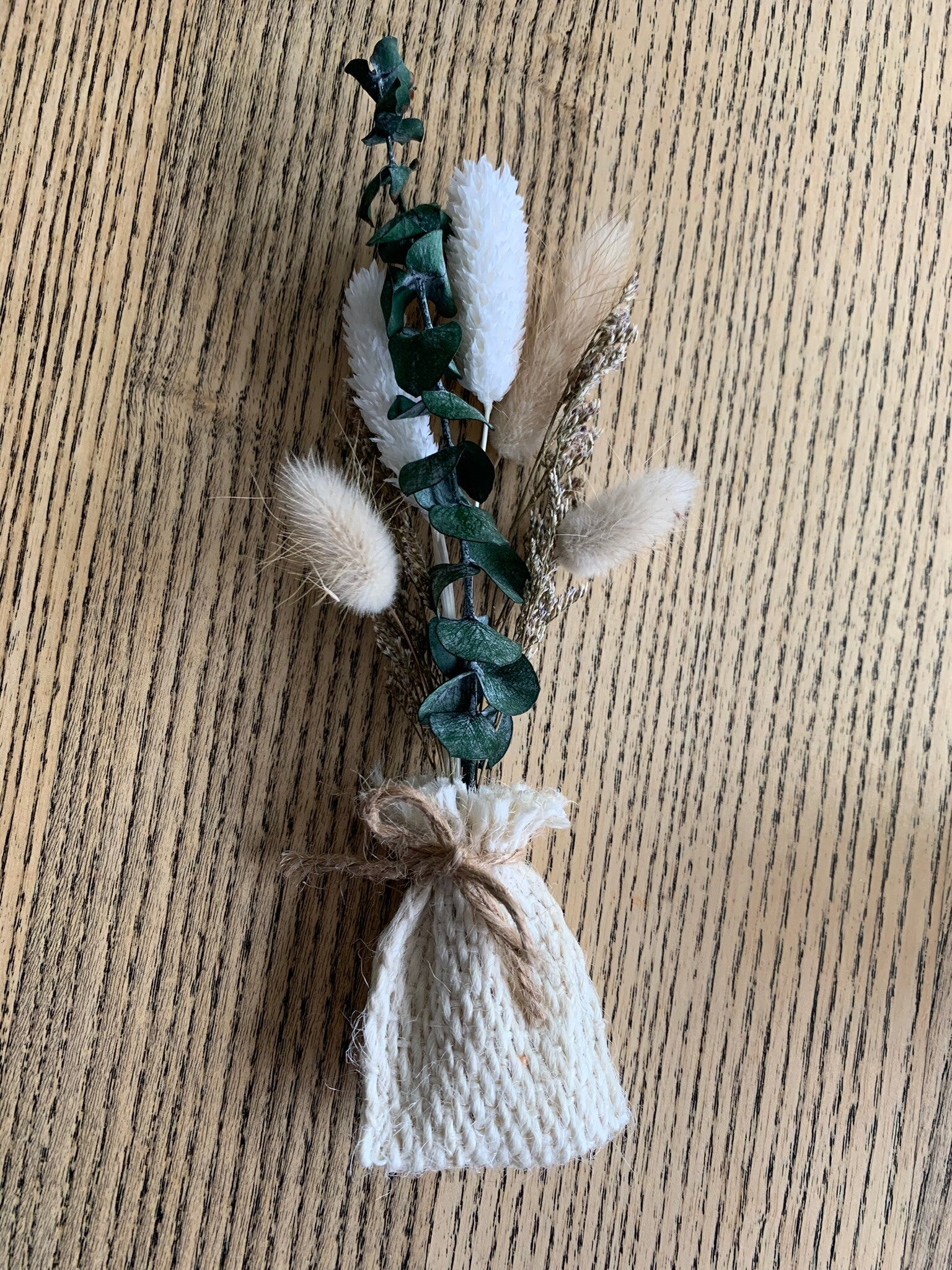 Mon fond est en raphia, et j'expose un bouquet de fleurs séchées dans un petit sac en toile.