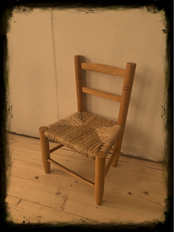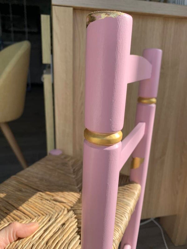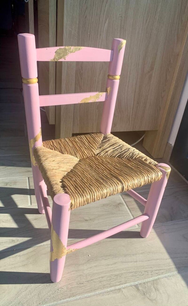 Je suis une chaise pour enfant toute délicate avec mon joli rose et mes feuilles d'or