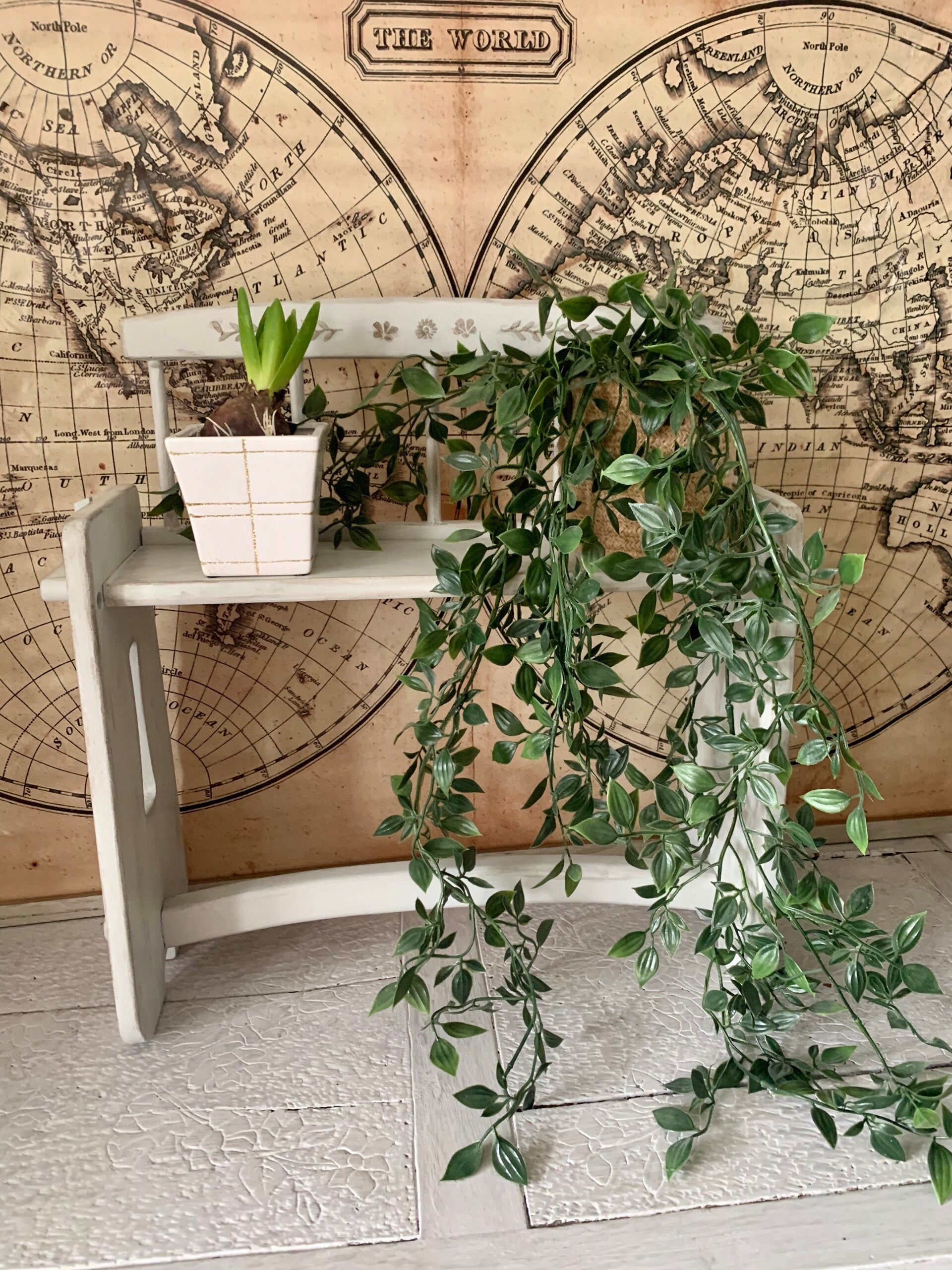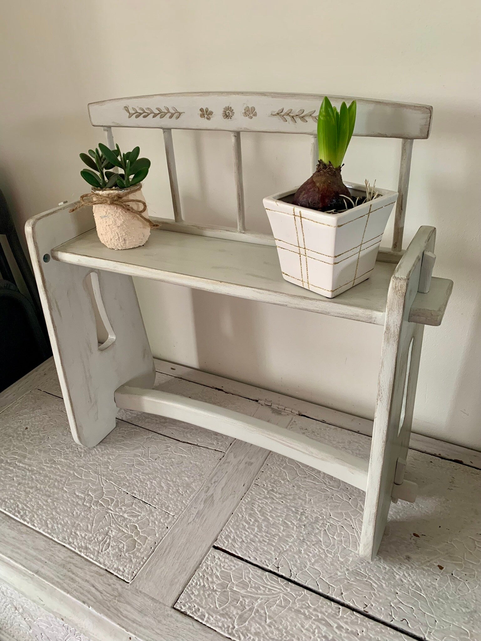 Je suis en bois de hêtre, et comme je suis assemblé par des chevilles, j'ai pu prendre cette forme de banc que tu pourras m'utiliser pour décorer avec des plantes tombantes, de la déco etc...
