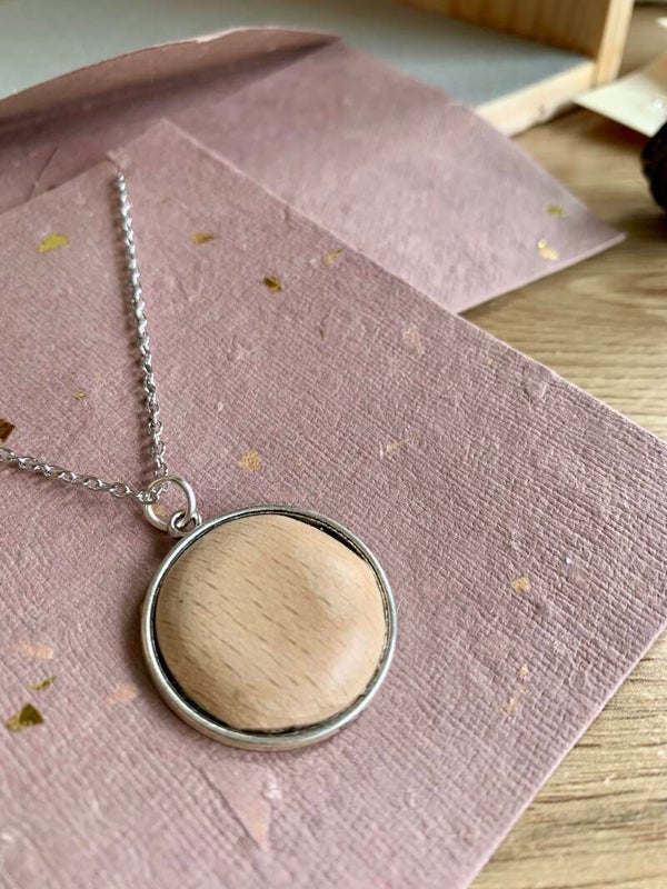 Optez pour ce collier unique et original avec son support cabochon en métal argenté et son bois de hêtre, essence de bois claire.
