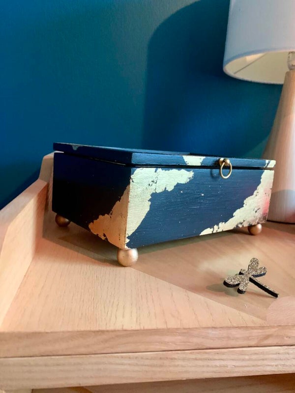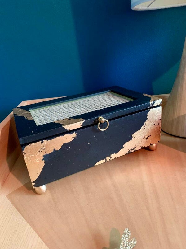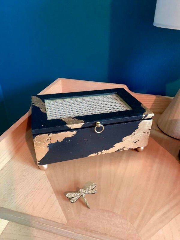 Boîte à bijoux/souvenirs/trésors, détournée, noire/or