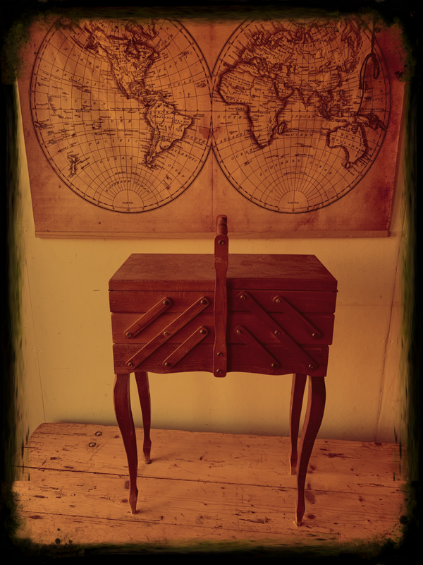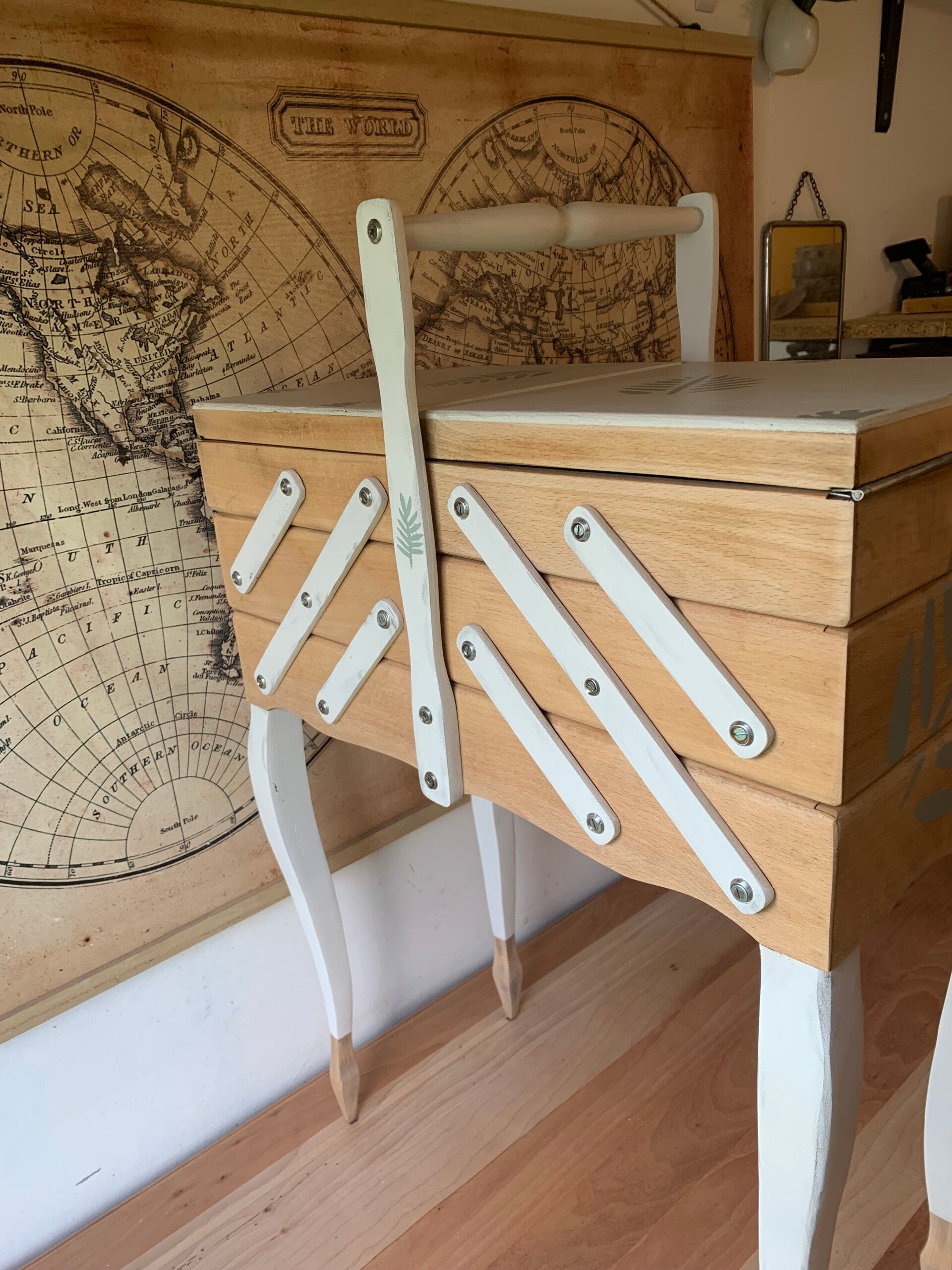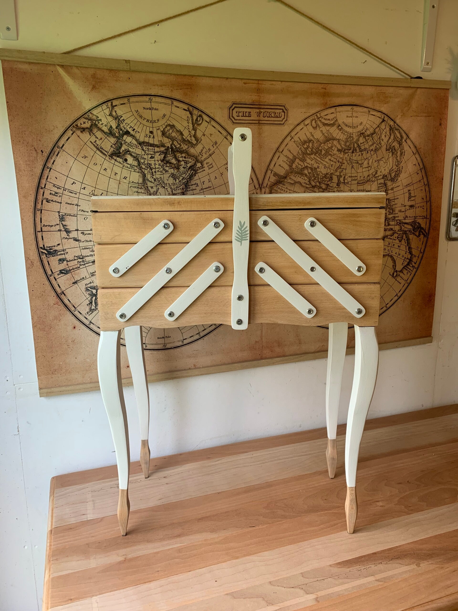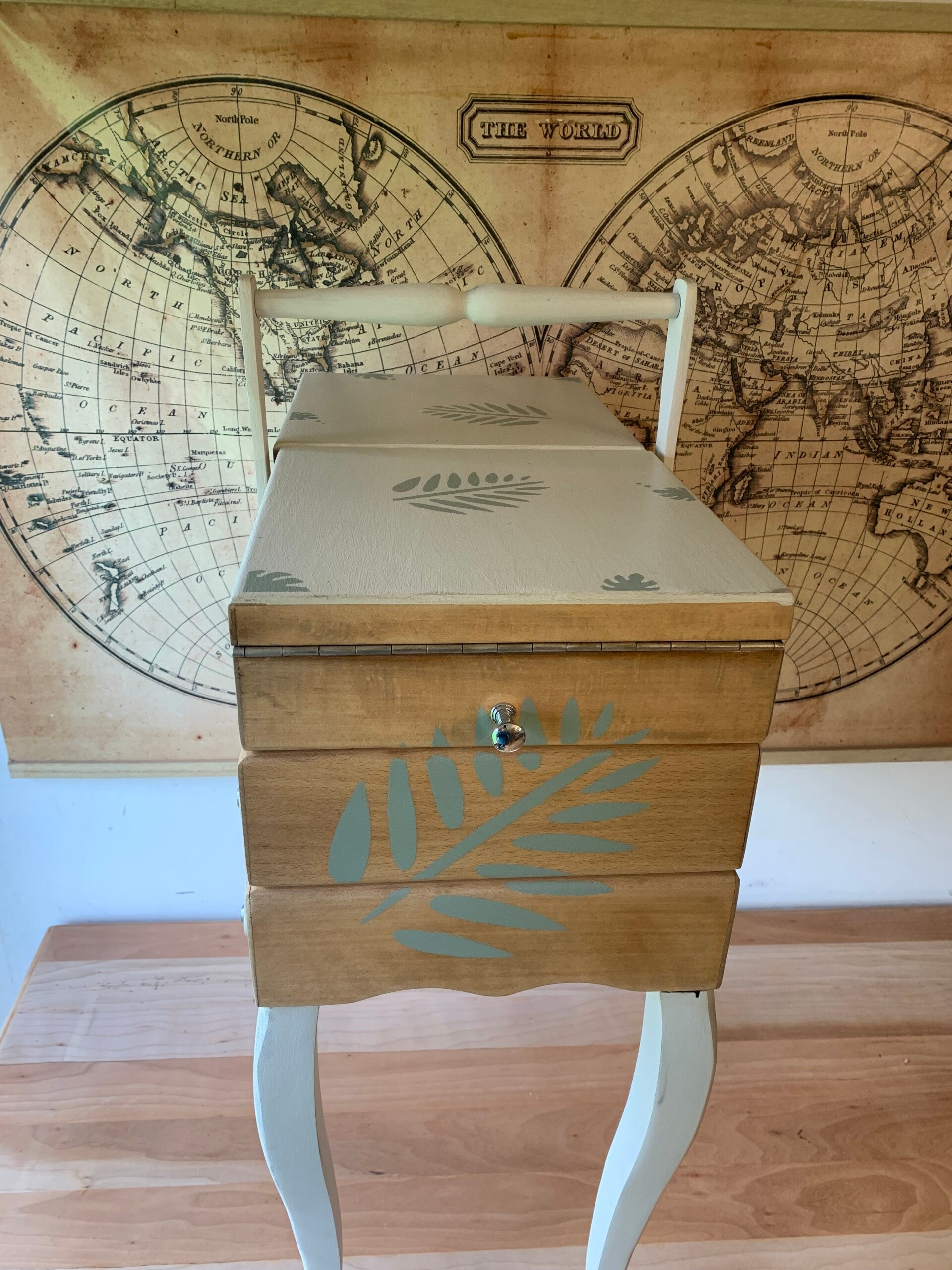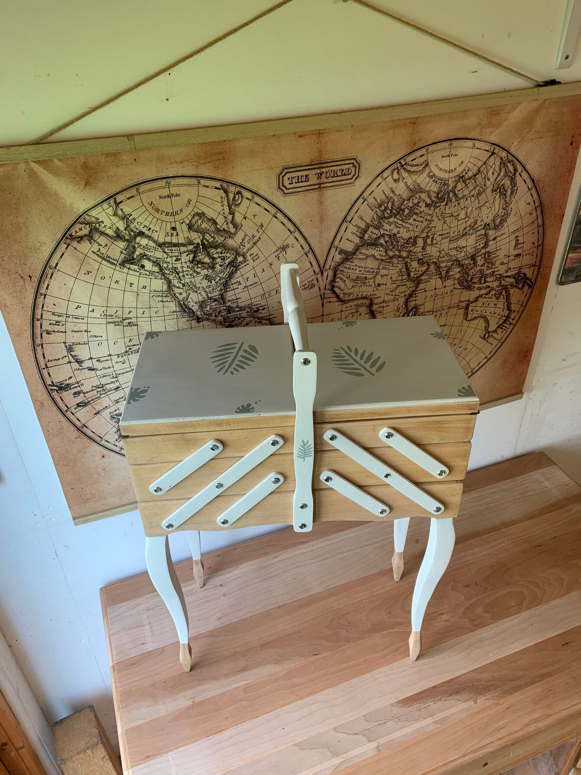 Je suis une travailleuse de couture vintage, autrefois les dames m'utilisaient pour ranger leurs travaux d'aiguilles.