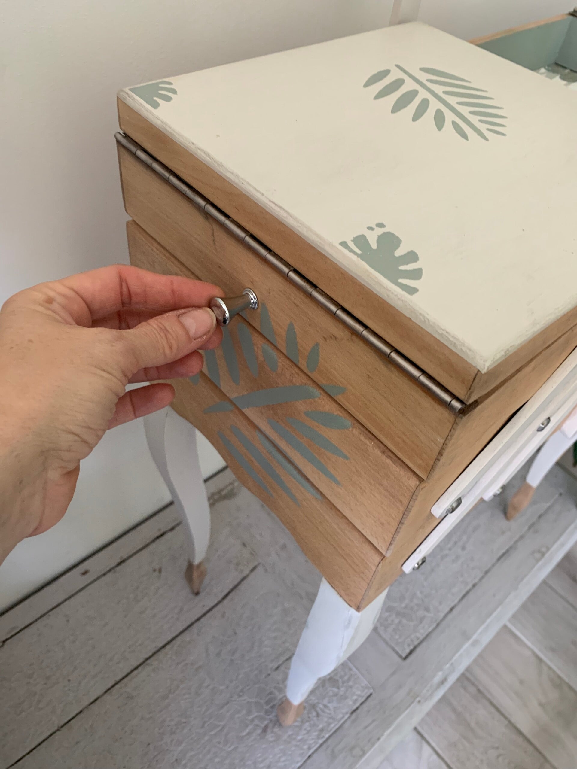 Aujourd'hui, je suis une pièce unique, grace à mes decorations aux pochoirs et ma nouvelle couleur. Ce blanc falaise et ce bois brut me mettent en valeur!