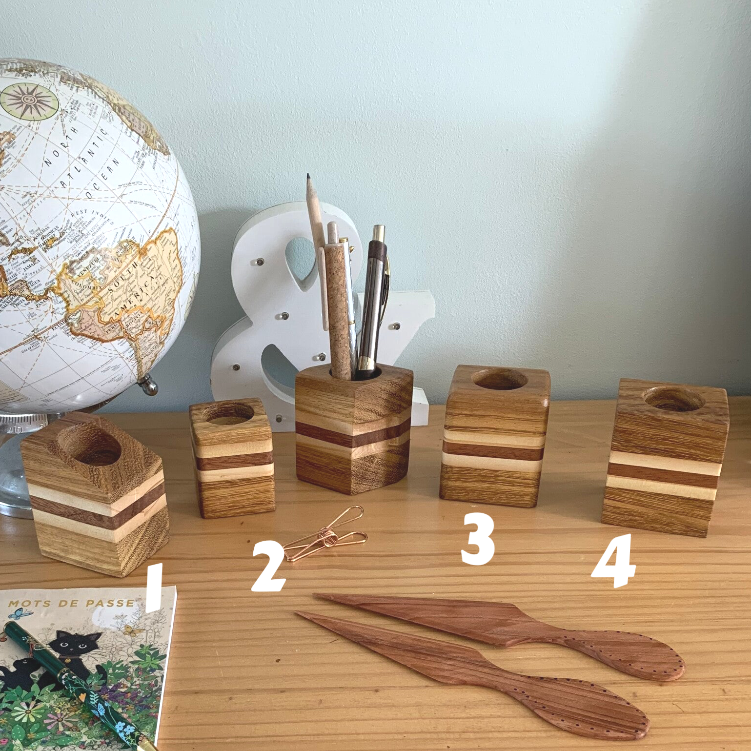 Les différentes essences de bois utilisées font de ces rangements pour stylos des objets chics et intemporels.
