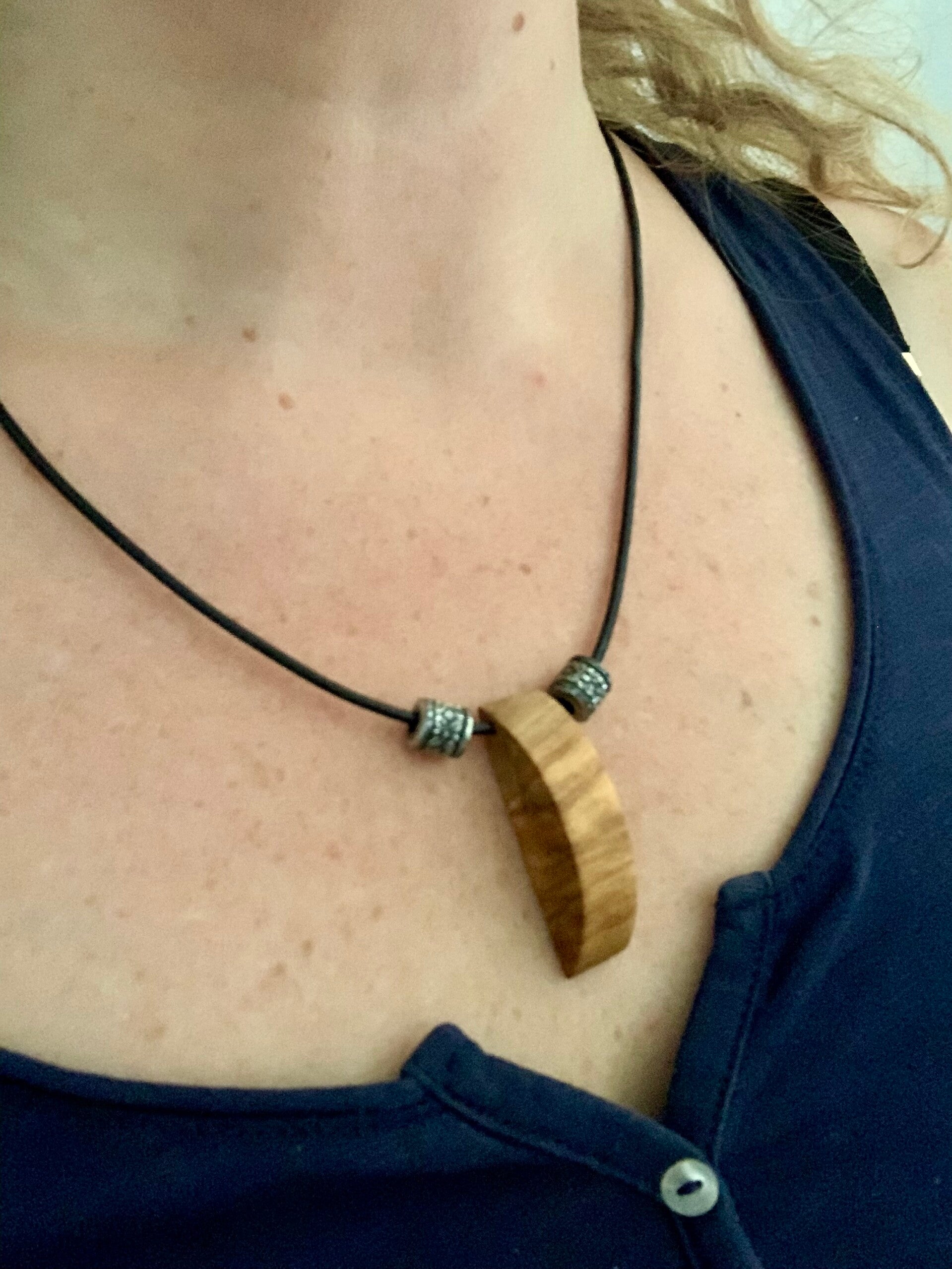 Ce collier est une pièce unique, en cuir et en bois d'olivier issu du réemploi des matières.