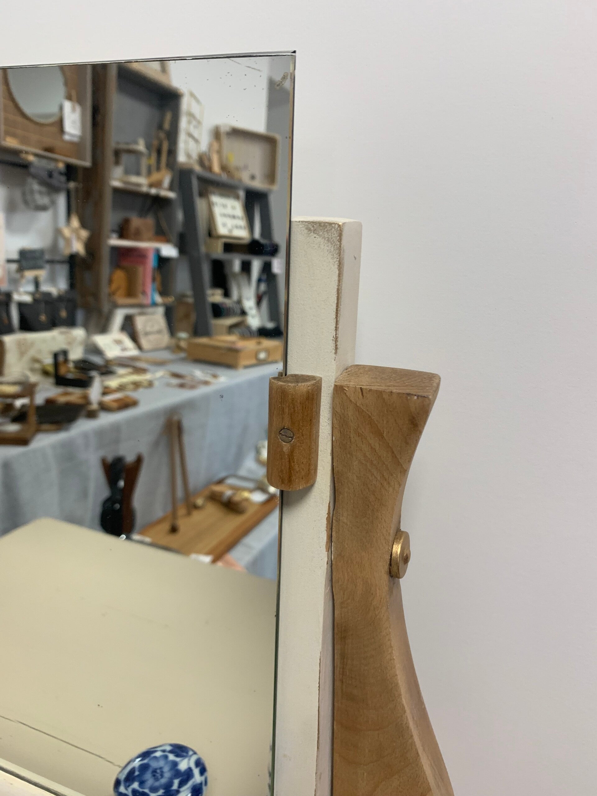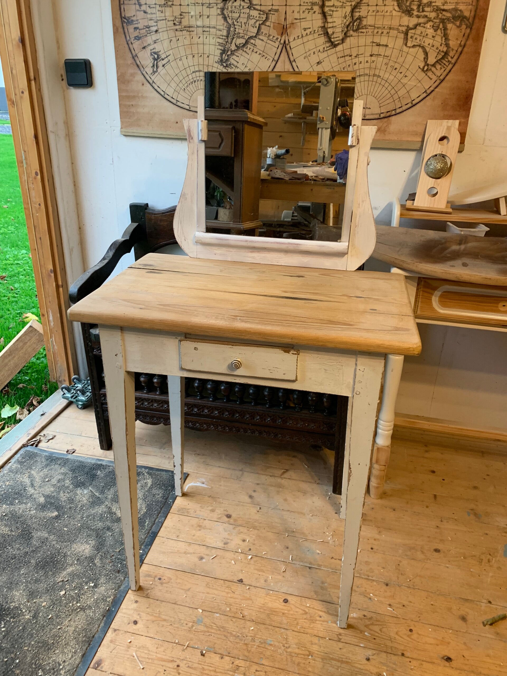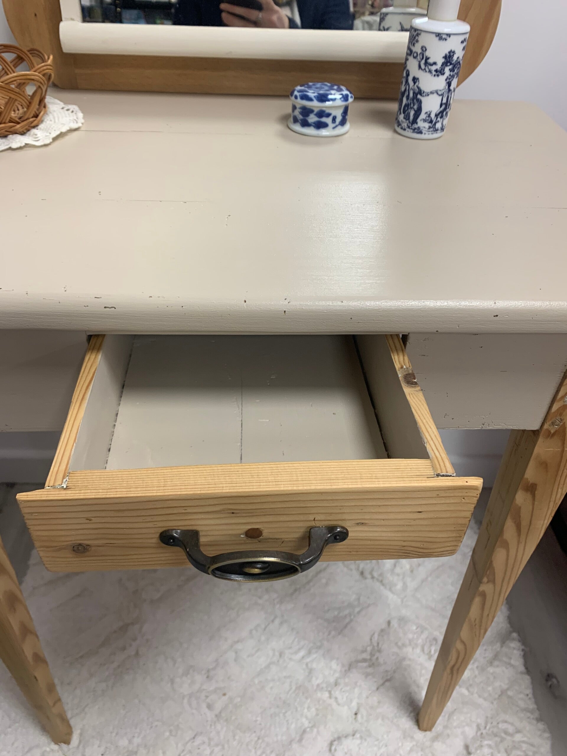je suis débarrassée de ma peinture blanche mal posée et me voici avec un plateau réparé et peint (beige calcaire), des pieds et un tiroir bruts.