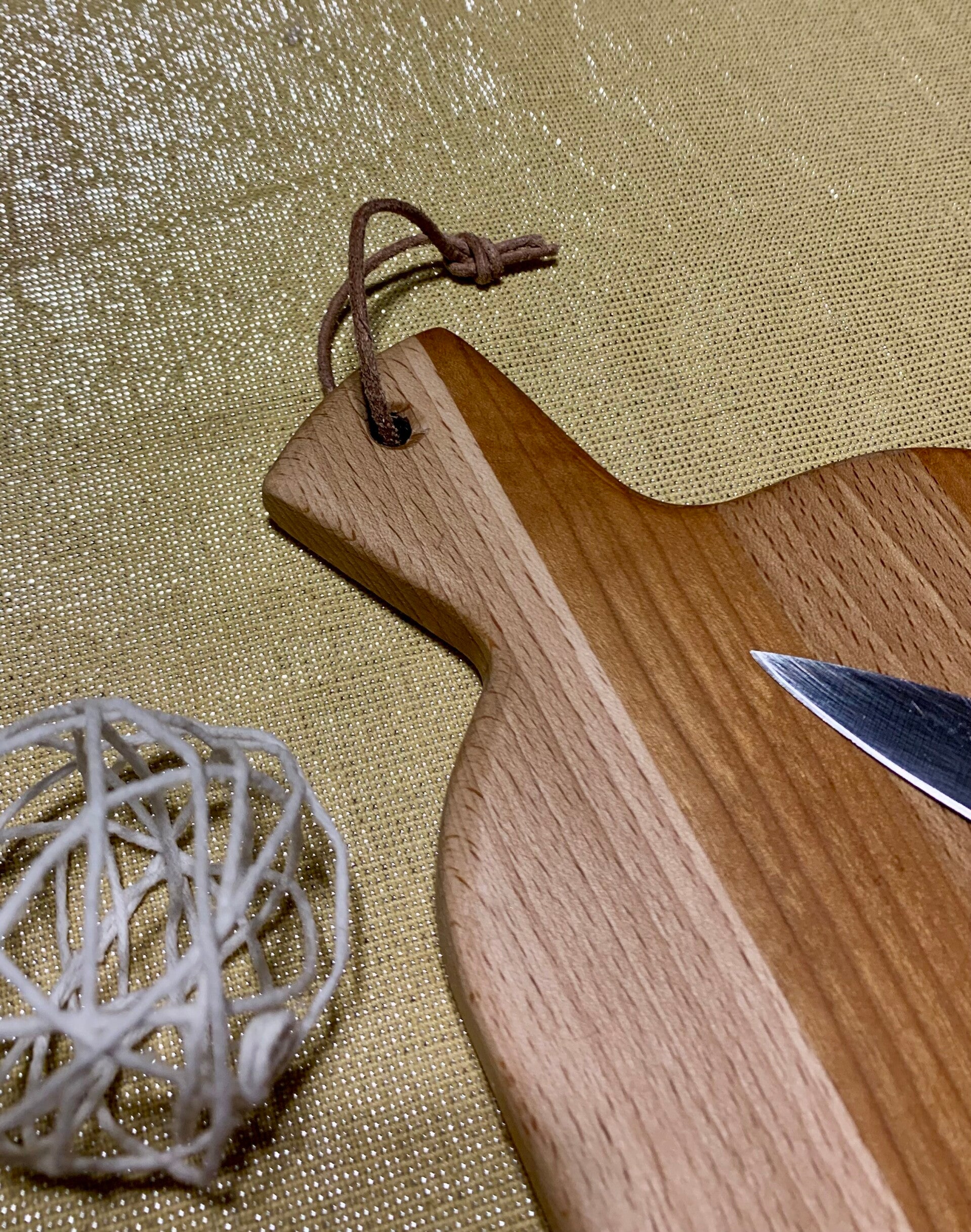 Cette planche a une forme unique, une poignée et un petit lien pour la suspendre au dessus de votre plan de travail.