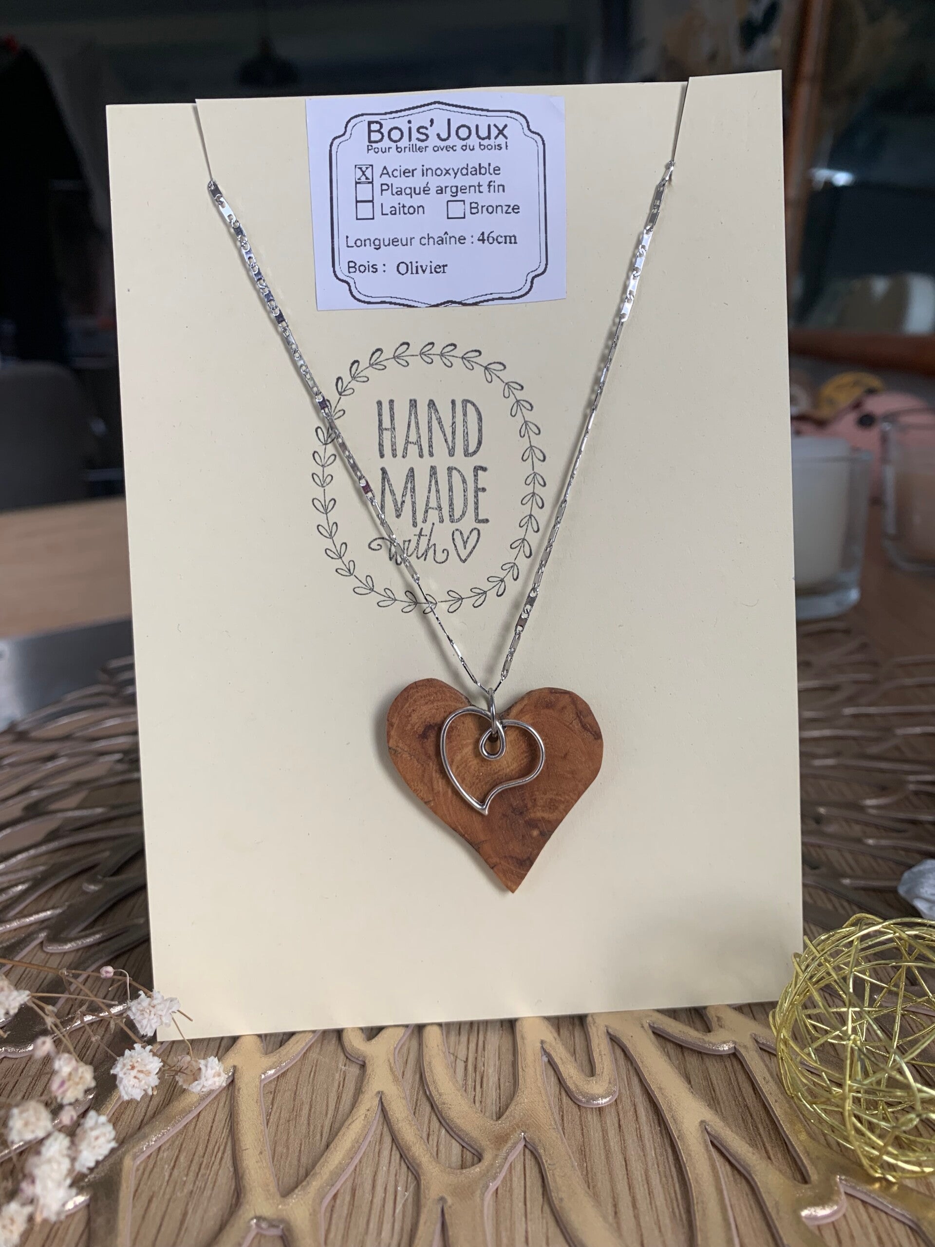 Ce collier avec son pendentif en forme de coeur a été inspiré par la forme naturelle de cette chute d'olivier.