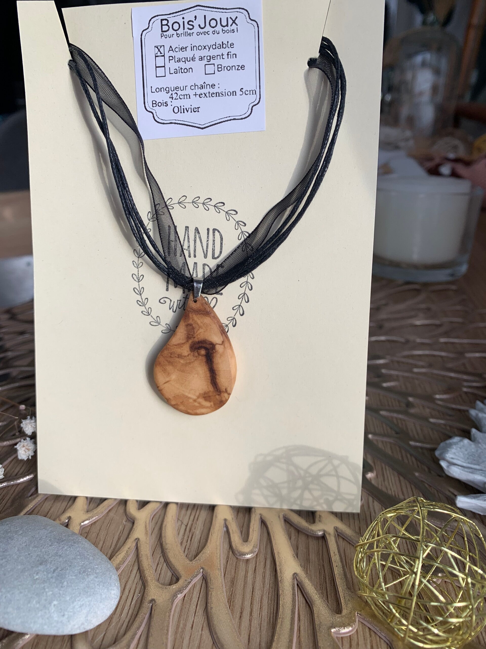Son pendentif goutte en olivier est issu de la valorisation de chutes, d'un atelier d'une consoeur, tourneuse sur bois.